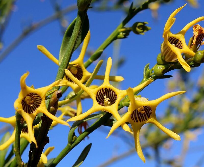 Anthocercis ilicifolia, an upright, branched shrub, about 2 m high. The leaves are fleshy, clearly toothed and 5 cm long. Flowers yellow with purple to maroon stripes.
