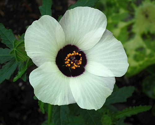 Hibiscus trionum, also known as hibiscus or hour flower, is a bushy plant with silvery-yellow flowers, with a chocolate-purple center. The flowers are 7-9 cm in diameter and appear in large numbers in summer and autumn.