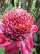 Etlingera elatior (also known as torch ginger, ginger flower, red ginger lily, torchflower, torch lily, wild ginger, combrang, kecombrang, bunga kantan, Philippine wax flower and porcelain rose) is a species of herbaceous perennial plant in the family Zingiberaceae; it is native to Thailand, Malesia and New Guinea.