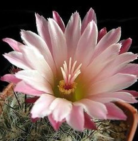 Pyrrhocactus floccosus, native to Chile, with strong white-creamy coloured woolliness all over the body. Flowers 3-4 cm long and 3 cm in diameter, purple, pink and pale yellow to creamy.