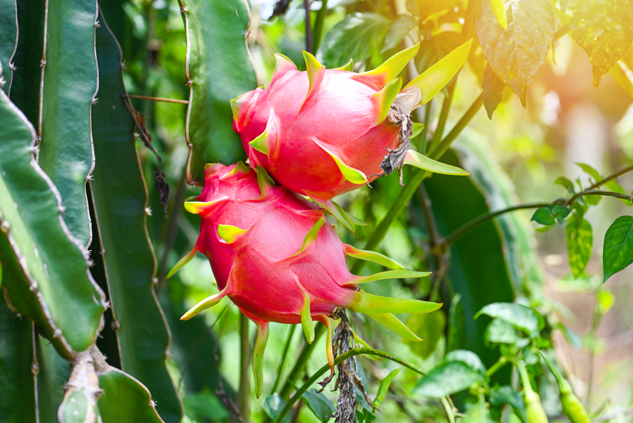 Other common names include Red Pitaya, Strawberry Pear, Night Blooming Cereus, Queen of the Night, and Honolulu Queen. Hylocereus undatus or commonly known as Dragon Fruit is a climbing cactus or succulent shrub with triangular stalks that can be up to 7 m long. It produces aerial roots enabling it to climb and support itself. It is widely cultivated for its edible fruit with a sweet and pleasant flavor. The fruit is red, 7-12 cm long, and covered in prominent scales. The flowers are white but yellowish-green on the outside and open at night. The plant is also used as an ornamental plant. It is fast growing and can be grown in semi-shade or full sun.