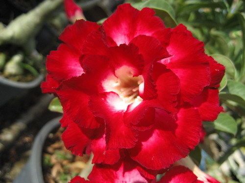 Adenium obesum AekSiam, known as desert rose, a caudex plant with bright red flowers with a white center.
