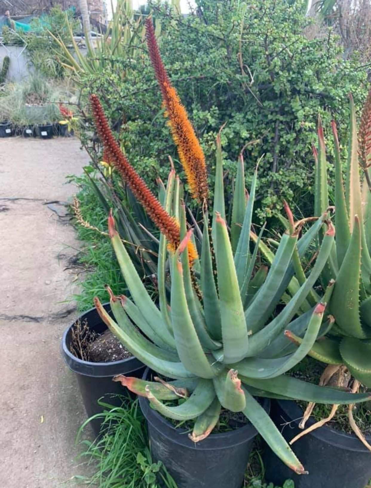 Aloe castanea, also called cat's tail aloe, usually has a single stem. The leaves are covered with small brown teeth. The dark orange-brown flowers are covered with protruding stamens.