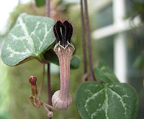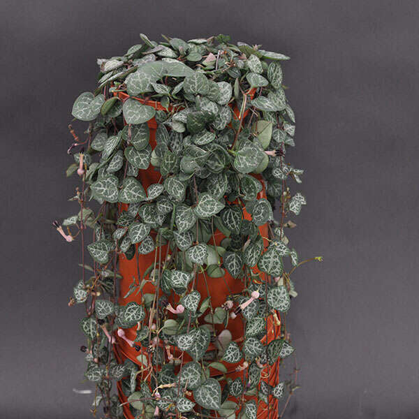 Ceropegia woodii, also called lamprey flower, grows as a plant with drooping droves. The leaves of Ceropegia woodii are heart-shaped, the flowers are relatively small, from pink to brown colored.