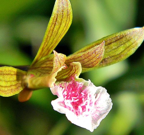 Eulophia graminea is a terrestrial orchid native to Asia. The flowers can rise to a height of 1 m with spreading flowers that are greenish with dark purple, netted veins