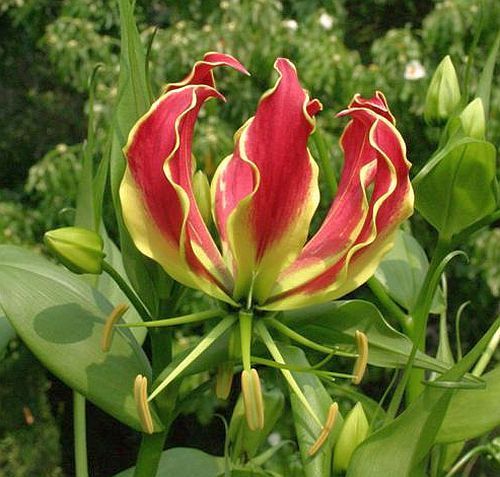 Gloriosa superba, called flame lily, is a perennial plant from South Africa, up to 2 m high. The beds of the Gloriosa superba are shaped like a lily, yellowish to orange-red and about 70 mm long.