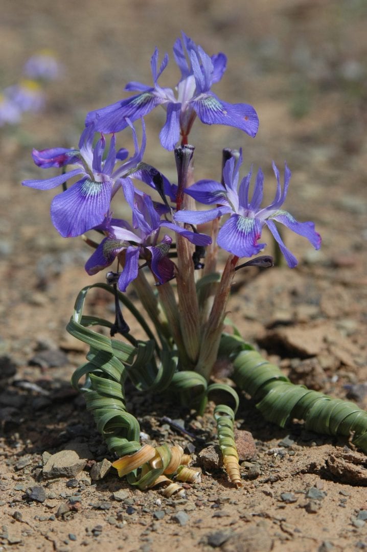 Moraea pritzeliana, syn. Gynandriris pritzeliana, is a spring blooming species native to western Karoo in South Africa. Out of the bulbs 2 coiled leaves appear and dark blue flowers with cream nectar.